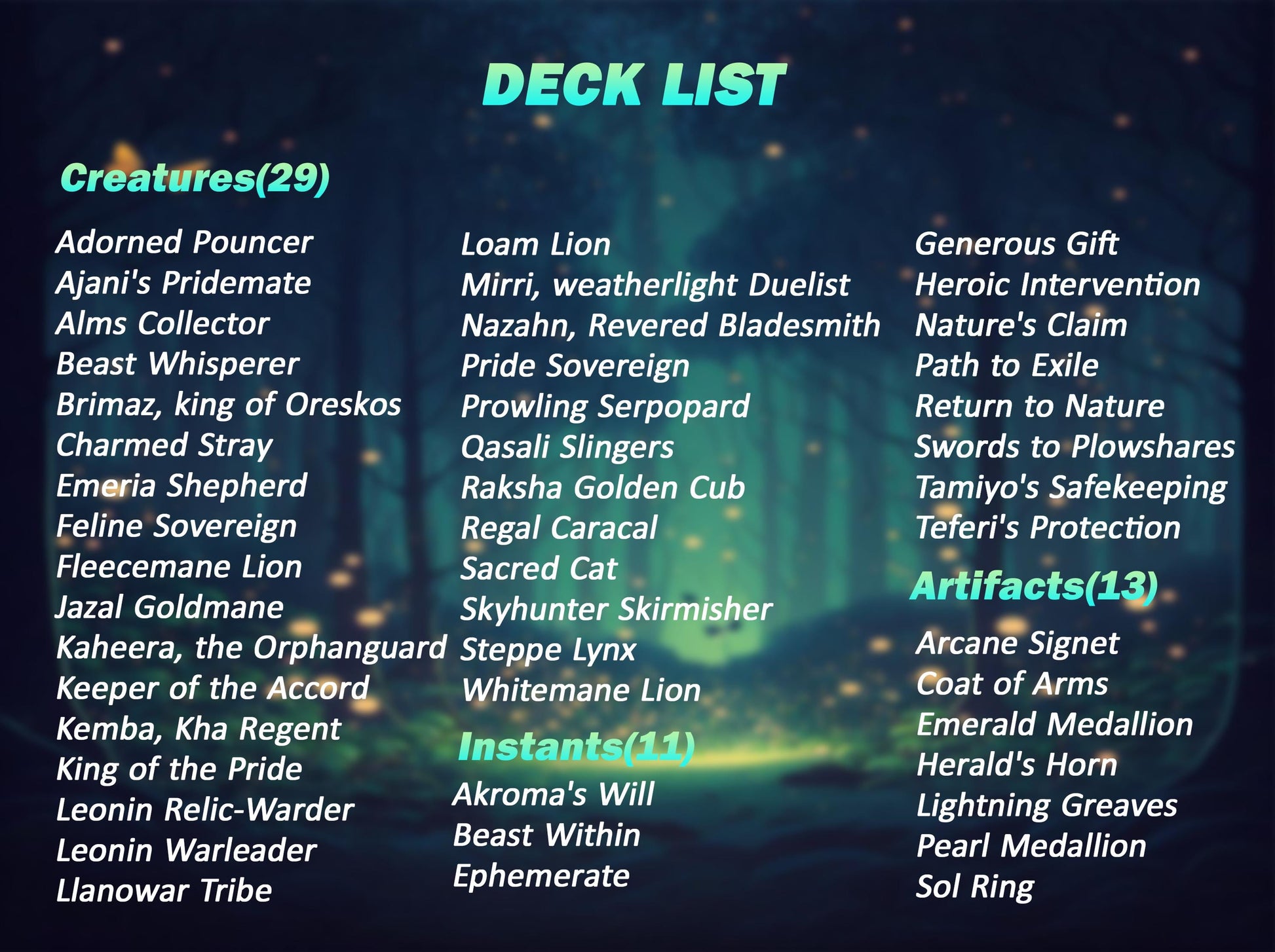 Lead with Arahbo, Roar of the World to pump your kitties and swing with style. Anointed Procession helps multiply tokens while Beastmaster Ascension boosts your whole squad. Fast, fun, and purr-fect for casual domination!