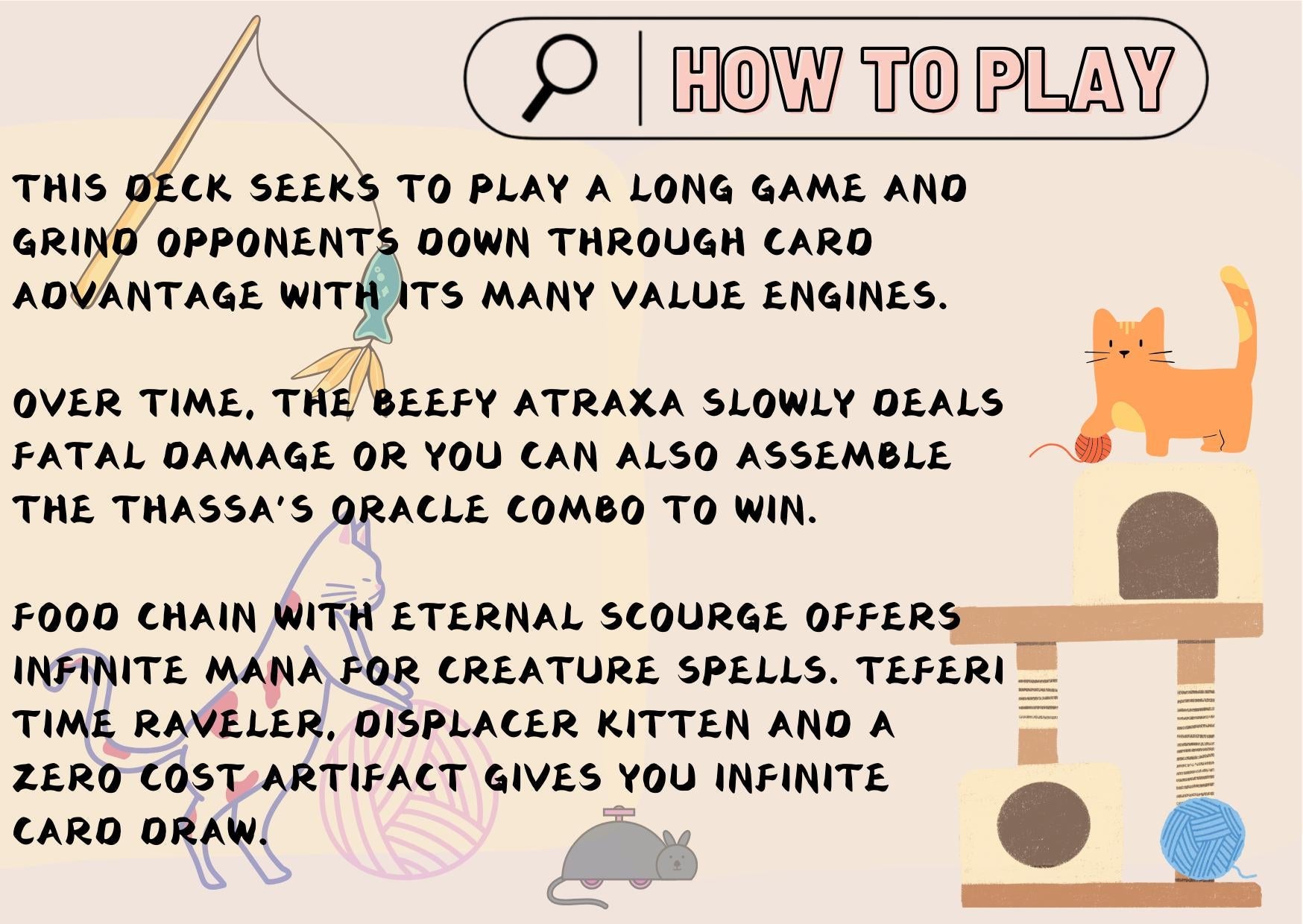 This deck thrives on patience and value. Use Atraxa’s card draw and proliferate synergy to build slow, steady advantage. Win through overwhelming board presence or close it out with combos like Food Chain or Thassa’s Oracle.