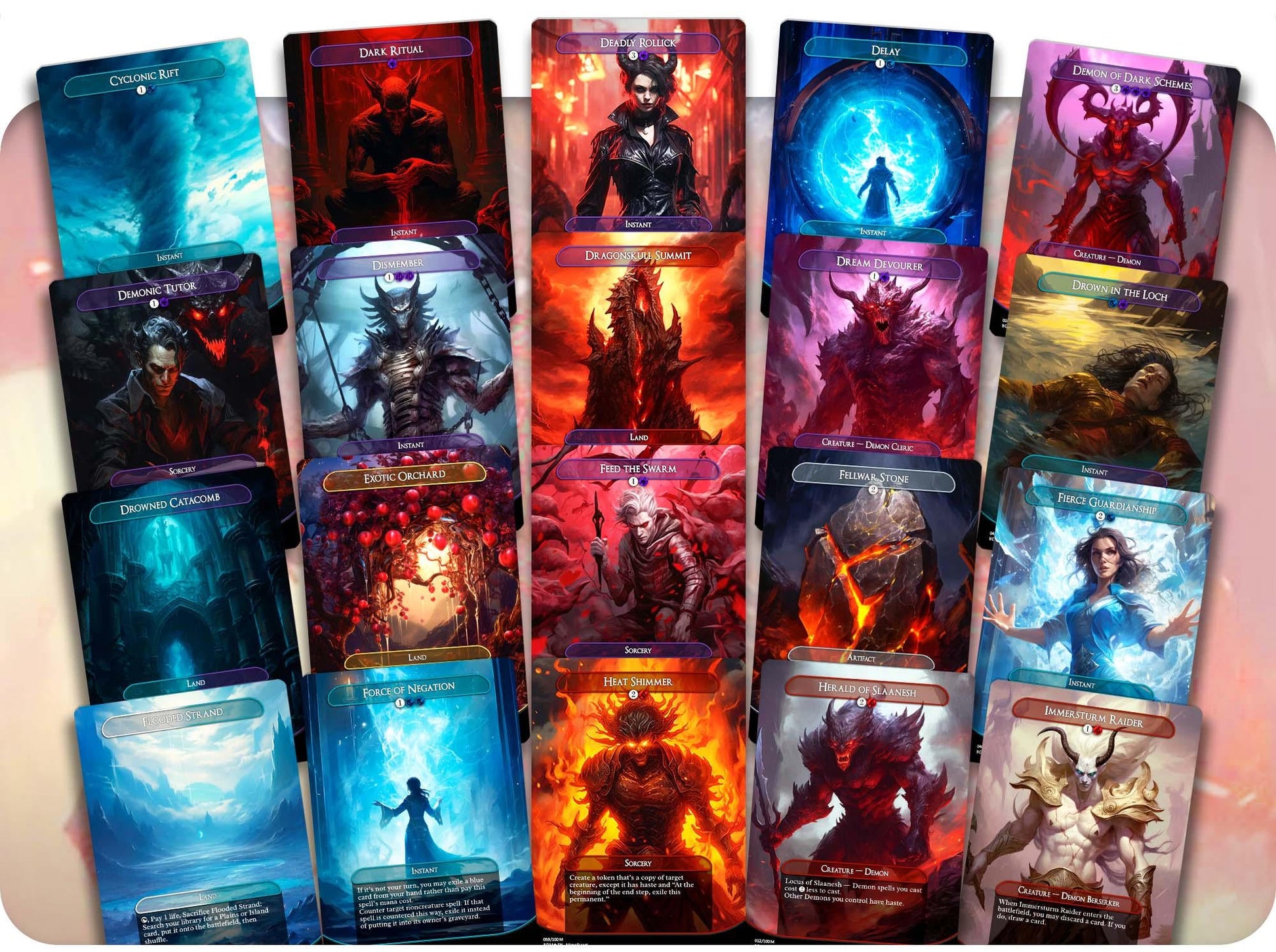 Our custom decks offer a truly unique experience, featuring fully framescustomized artwork, mana symbols, etc... designed to enhance the theme and style of each deck. Every card is meticulously crafted to provide a one-of-a-kind aesthetic while maintaining the quality you expect for seamless gameplay.
