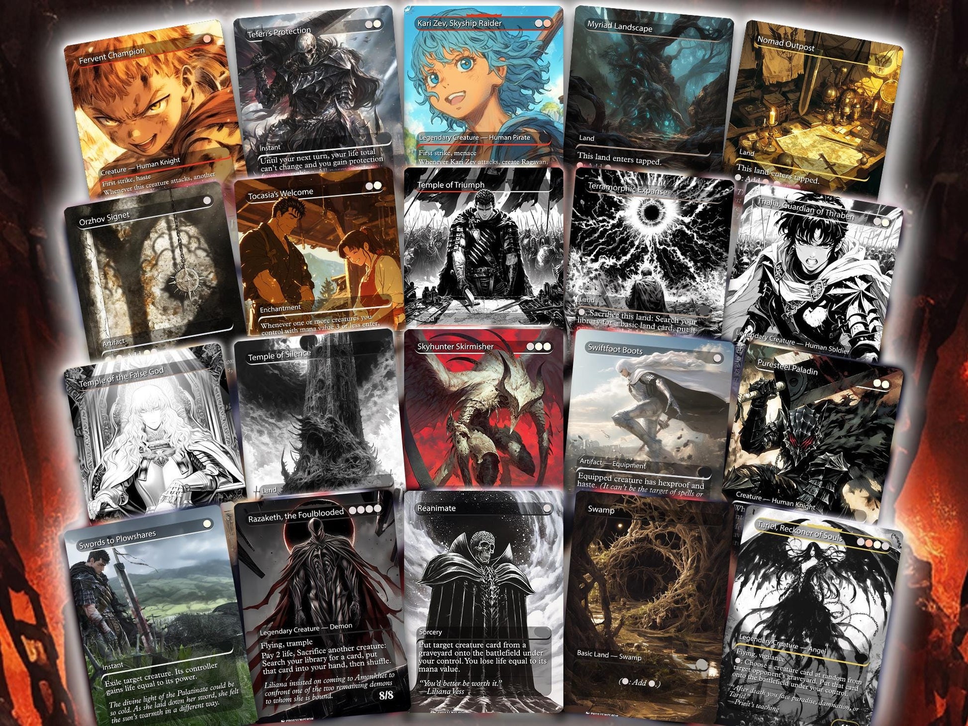 Our custom decks offer a truly unique experience, featuring fully framescustomized artwork, mana symbols, etc... designed to enhance the theme and style of each deck. Every card is meticulously crafted to provide a one-of-a-kind aesthetic while maintaining the quality you expect for seamless gameplay.