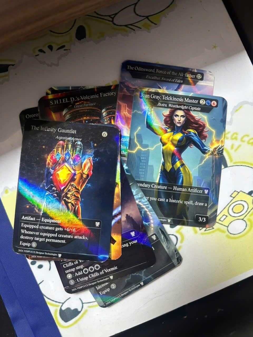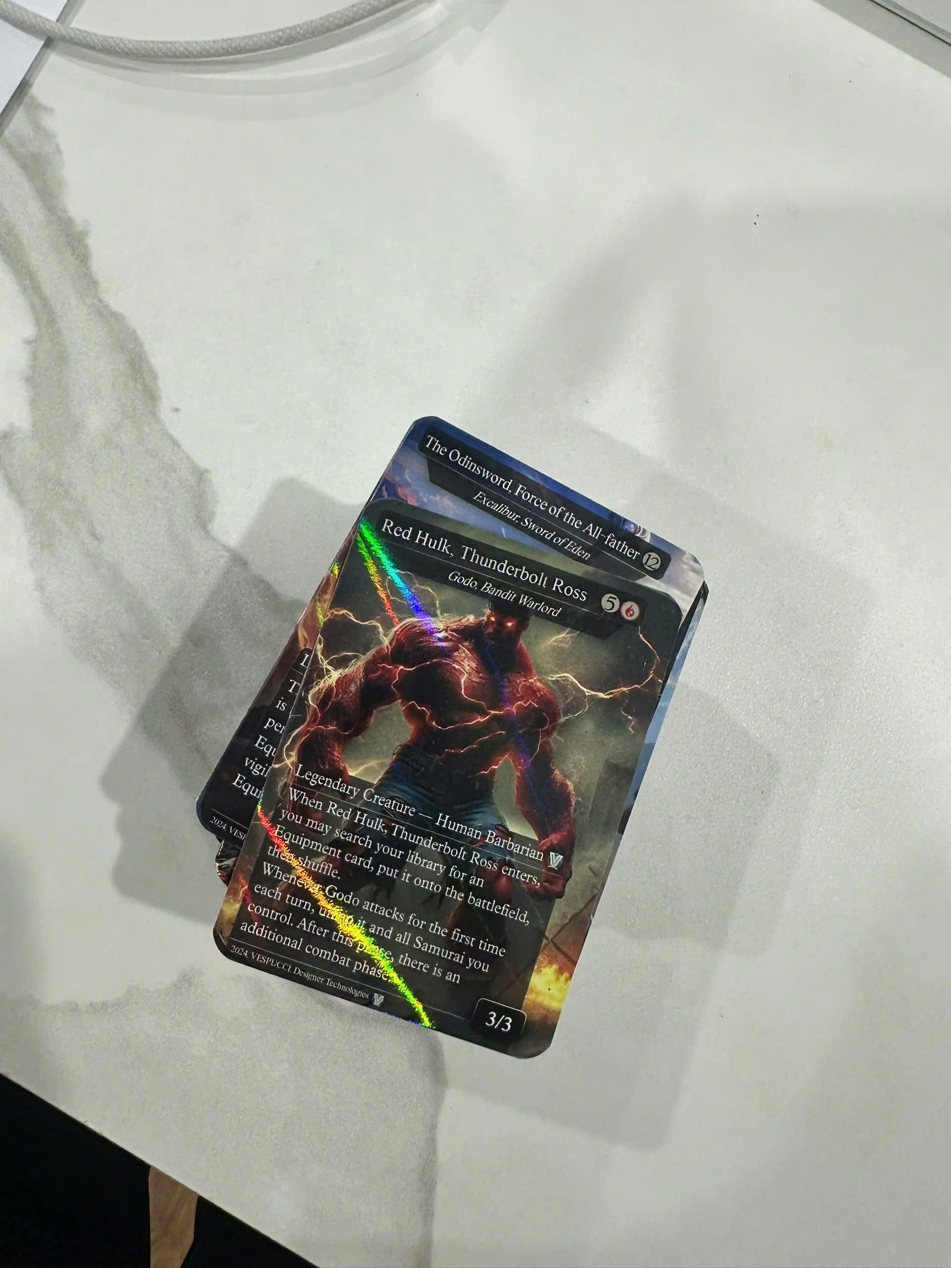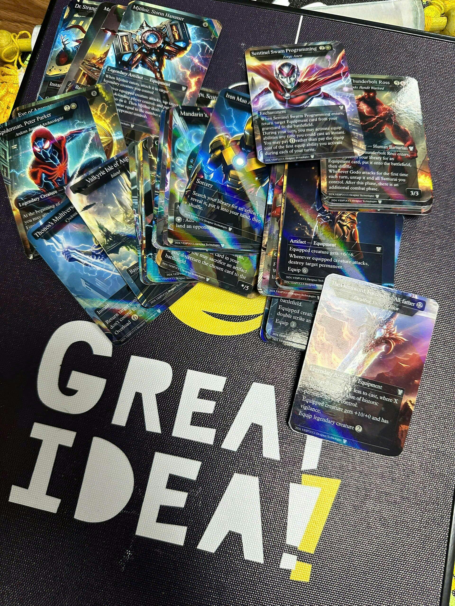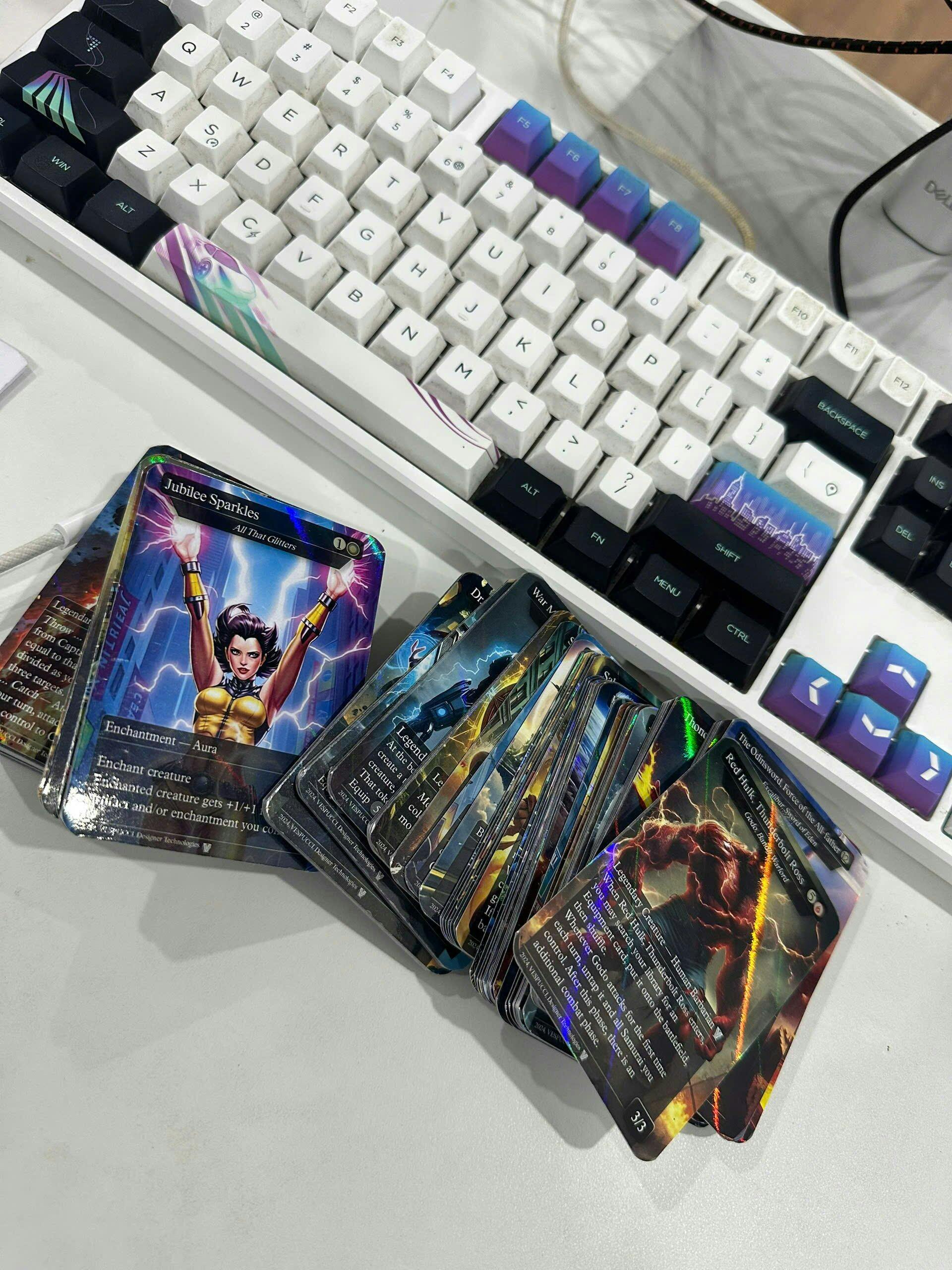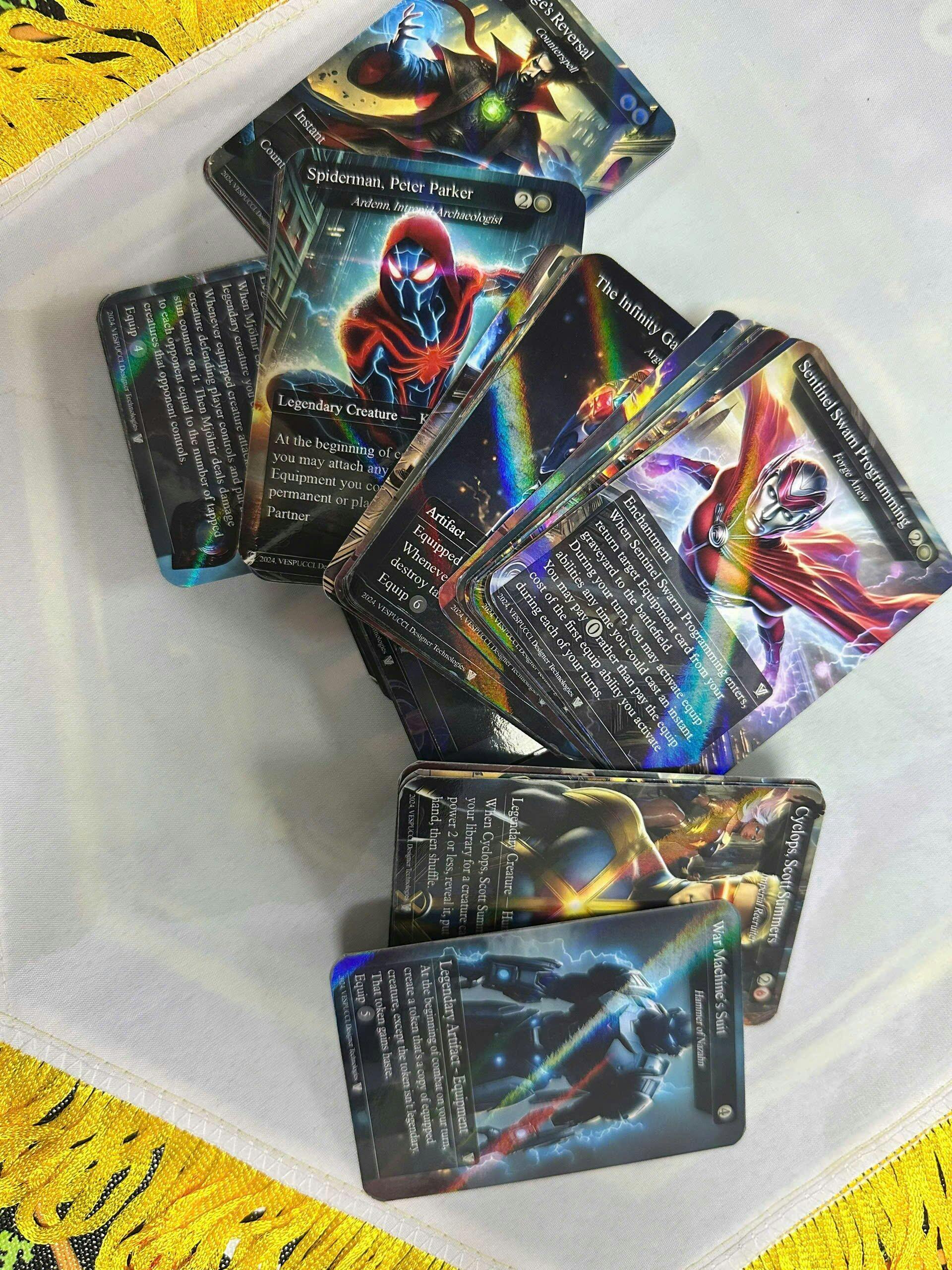 Our custom decks offer a truly unique experience, featuring fully frames, customized artwork, mana symbols, etc... designed to enhance the theme and style of each deck. Every card is meticulously crafted to provide a one-of-a-kind aesthetic while maintaining the quality you expect for seamless gameplay.