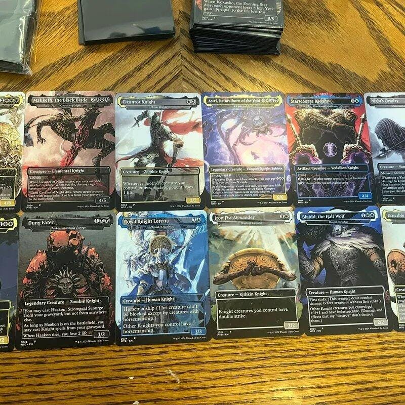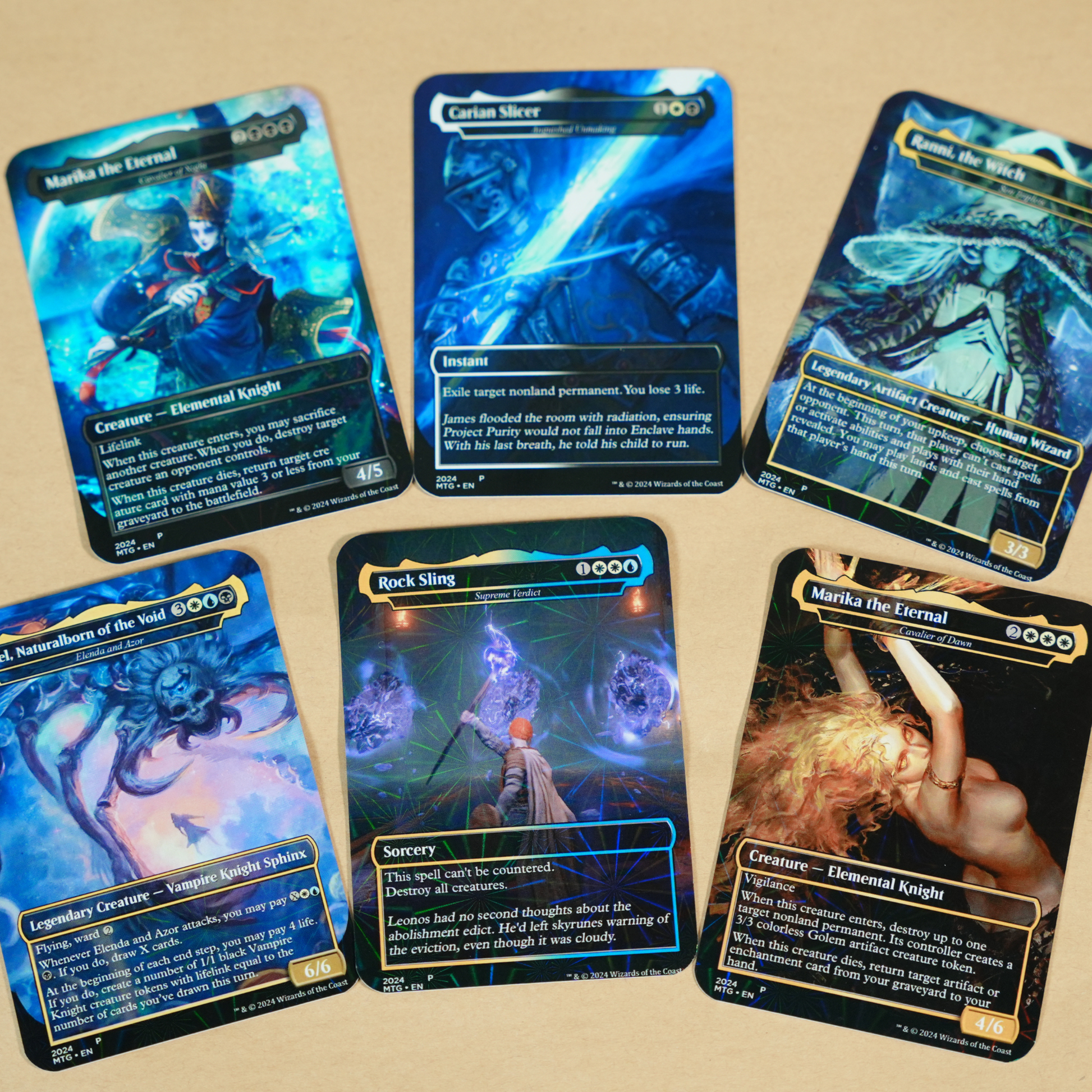 Our custom decks offer a truly unique experience, featuring fully frames, customized artwork, mana symbols, etc... designed to enhance the theme and style of each deck. Every card is meticulously crafted to provide a one-of-a-kind aesthetic while maintaining the quality you expect for seamless gameplay.