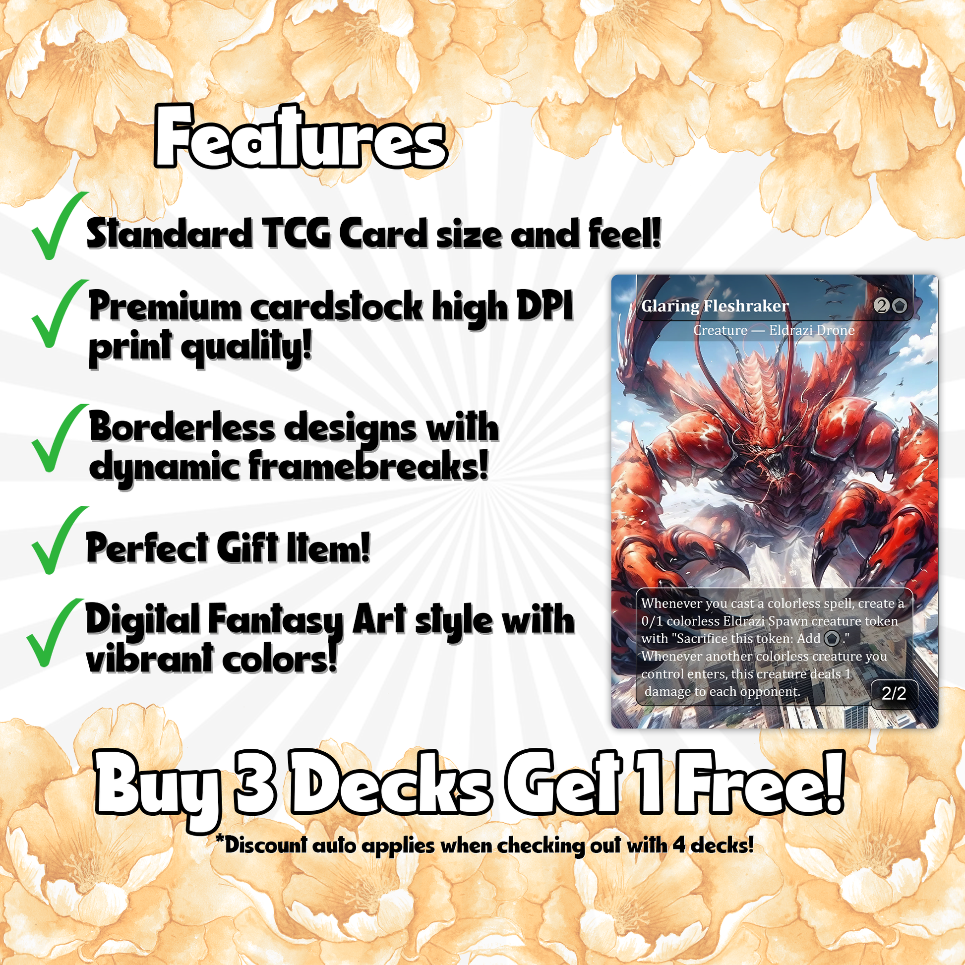 Our custom decks offer a truly unique experience, featuring fully framescustomized artwork, mana symbols, etc... designed to enhance the theme and style of each deck. Every card is meticulously crafted to provide a one-of-a-kind aesthetic while maintaining the quality you expect for seamless gameplay.