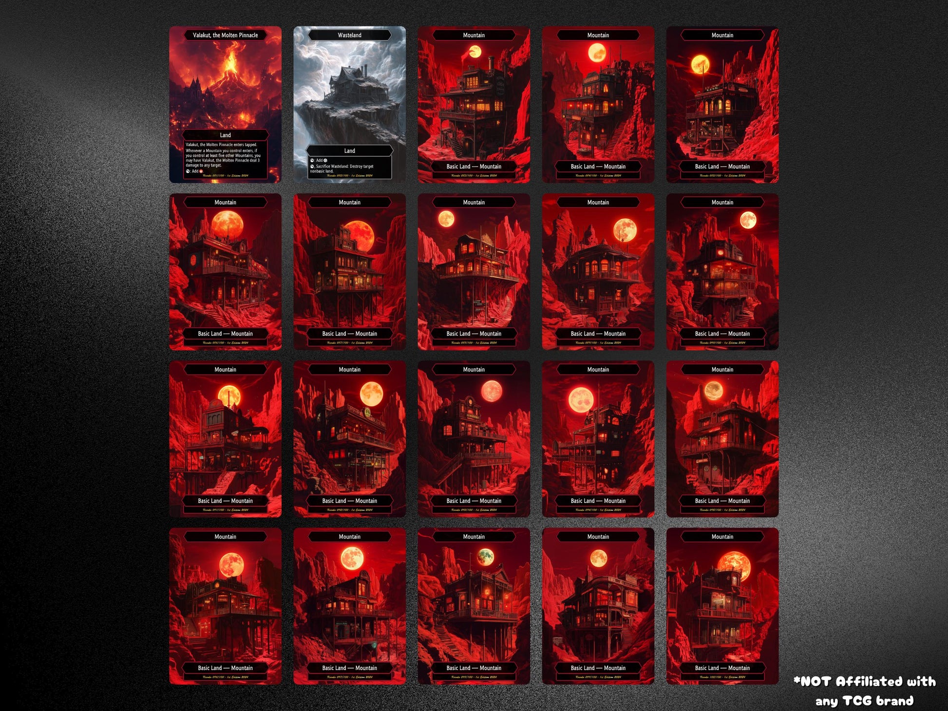 Our custom decks offer a truly unique experience, featuring fully framescustomized artwork, mana symbols, etc... designed to enhance the theme and style of each deck. Every card is meticulously crafted to provide a one-of-a-kind aesthetic while maintaining the quality you expect for seamless gameplay.