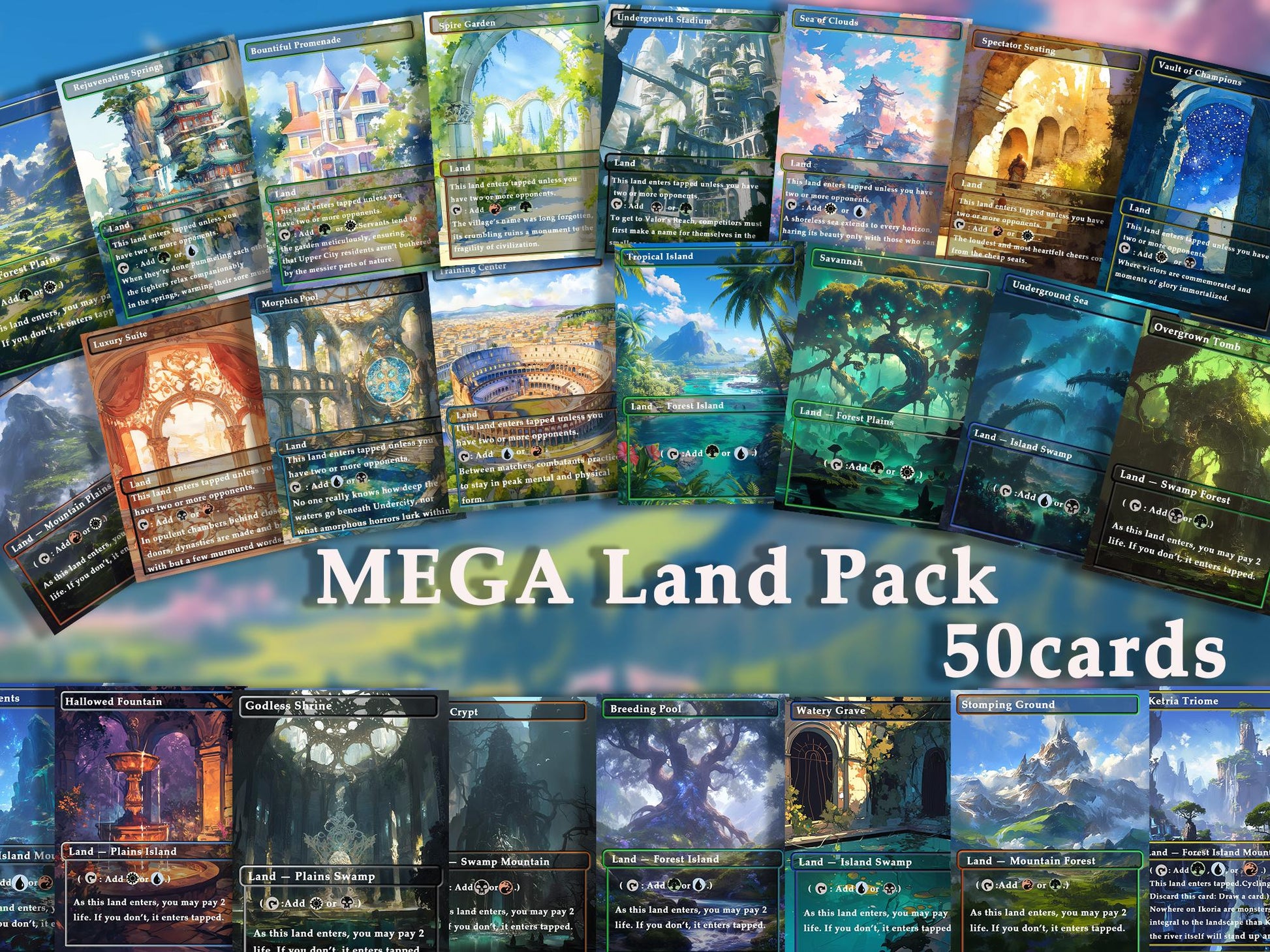 edh, mtg proxy lands, anime mtg lands, commander mana base, mtg basic lands, mtg custom cards, dual lands, fetch lands, mtg deck accessory, full-art lands, mtg watercolor land set, borderless lands, mtg proxies