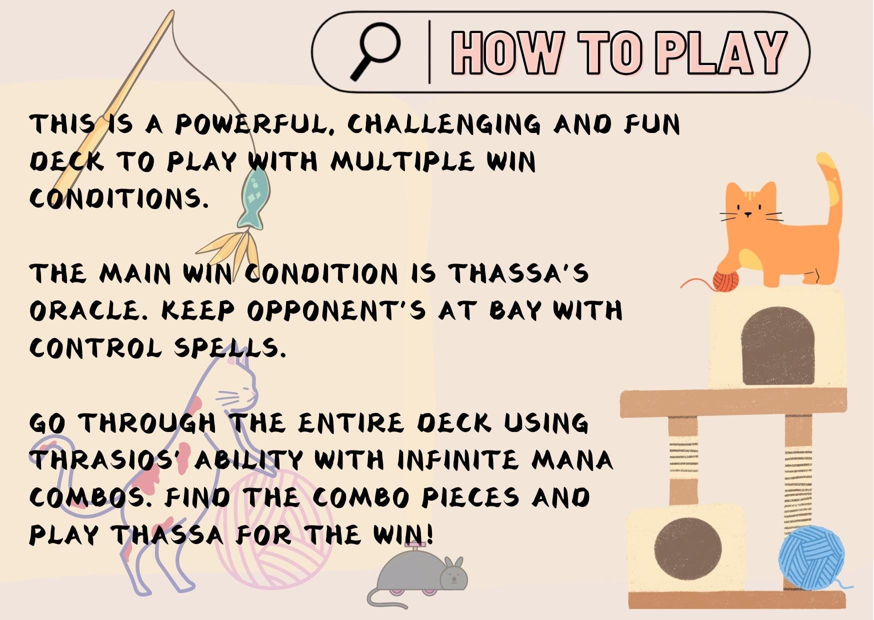 Designed for experienced players, this deck combines control spells with powerful combo lines. Win with Thassa’s Oracle after drawing your deck using infinite mana loops through combos like Kinnan + Basalt Monolith or Hazel Brewmaster + Devoted Druid. Disrupt with counterspells, then finish strong with precision.