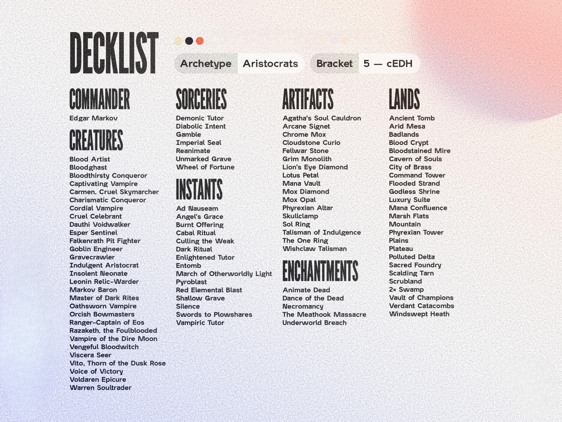 Embrace the dark allure of eternal night with this Edgar Markov Vampire Aristocrats deck. Designed for high-powered Commander tables, this deck unleashes a relentless army of bloodthirsty vampires while draining your opponents of life. A perfect blend of classic aristocrats strategies and vampire tribal dominance.