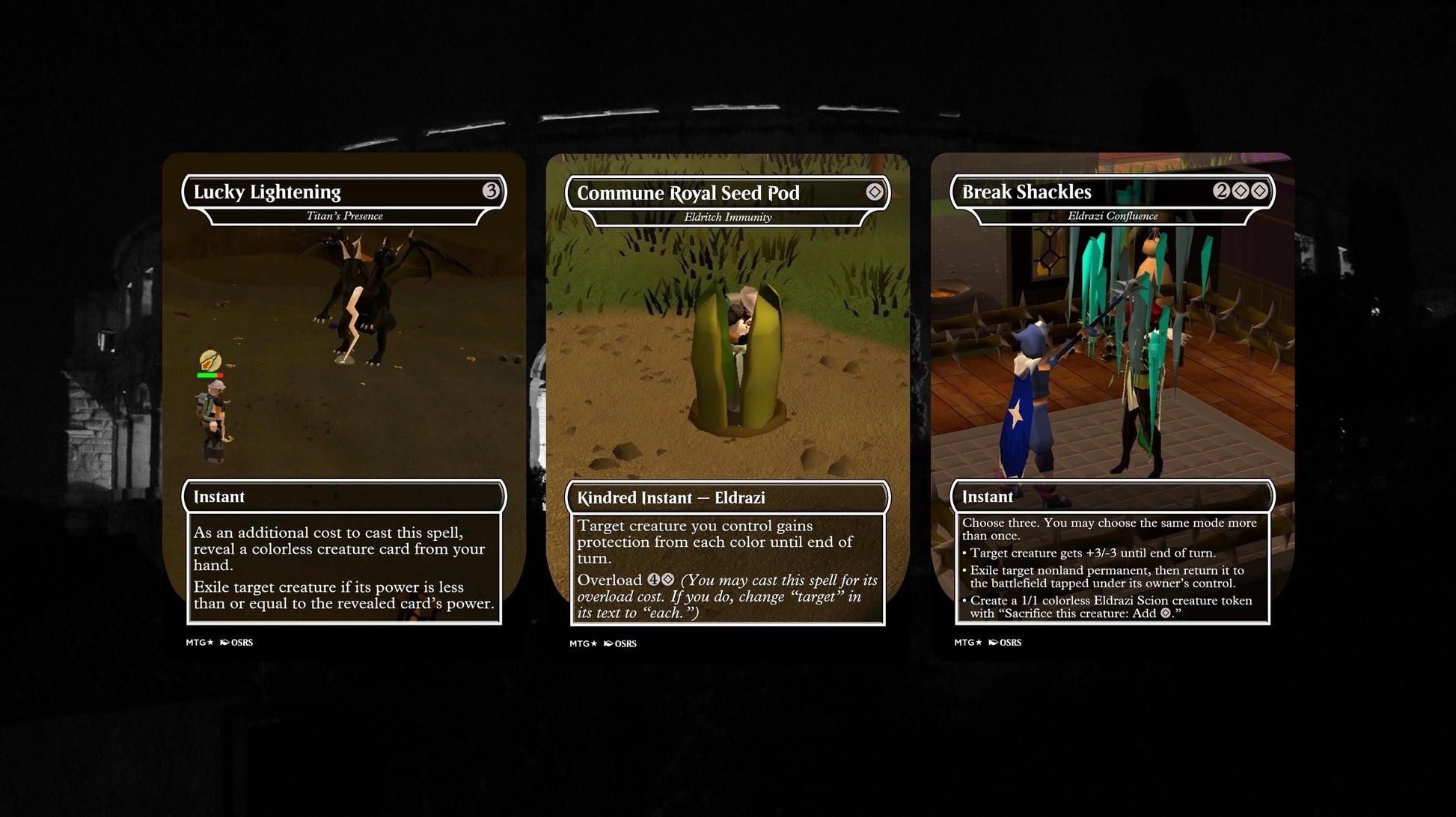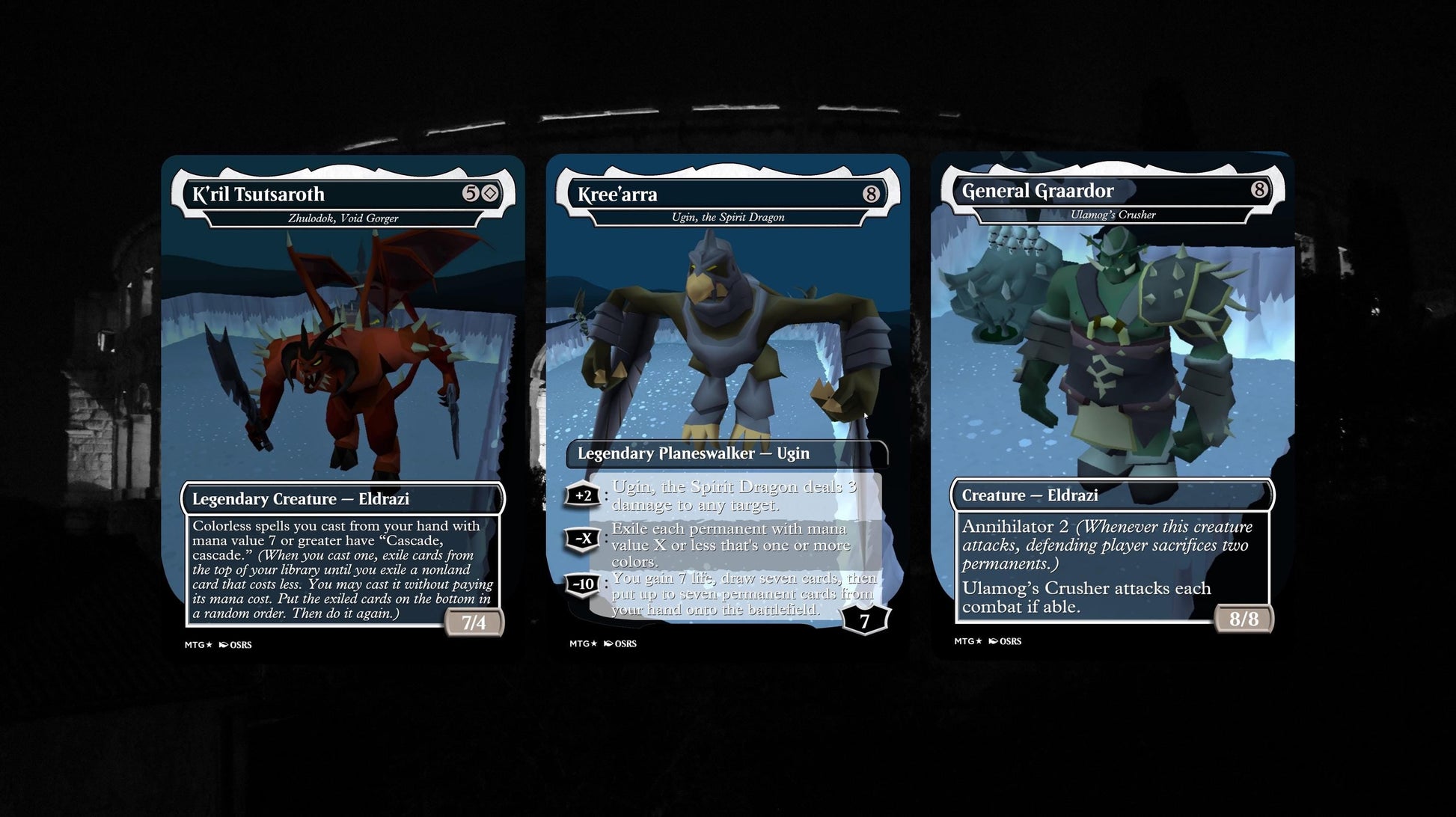 Ramp up into massive Eldrazi horrors with powerful mana rocks and lands. Leverage discard, annihilator triggers, and board wipes to dominate the game. Summon iconic OSRS bosses like Jad, Zuk, and the Godwars generals as your creatures while controlling the board with classic Eldrazi finishers. Whether you prefer Nex’s relentless aggression or Vardorvis’s cunning tactics, every game feels like a nostalgic raid.